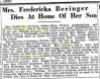 4. "Mrs. Fredericka Beringer Dies At Home Of Her Son," obituary, The Sheboygan Press, 5 June 1930; online image, Ancestry (http://home.ancestry.com/ : downloaded 1 August 2016), Newspapers and Publications: Sheboygan Press (Sheboygan, Wisconsin). page 2.