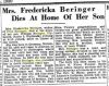 4. "Mrs. Fredericka Beringer Dies At Home Of Her Son," obituary, The Sheboygan Press, 5 June 1930; online image, Ancestry (http://home.ancestry.com/ : downloaded 1 August 2016), Newspapers and Publications: Sheboygan Press (Sheboygan, Wisconsin). page 2.