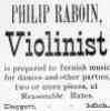 Gifted musician -- played the violin. He organized several orchestras, and in the Daggett area, he was known as "Professor Raboin." He also ran several businesses, and while he was never able to live independently, he did as much as he could to be self-sufficient. He was also very well-read -- in braille, of course -- and continued to learn all his life, and even attended college classes at St. Norberts. His brothers and sisters loved him with a respect bordering on reverence.