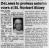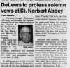 Obituary: "Upon entering St. Norbert Abbey, he was vested as a novice on 28 August 1942. He professed Simple Vows on 27 September 1943, Solemn Vows on 7 June 1946 and was ordained to the Priesthood on 15 June 1946."Endnotes