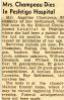 "'Grandma Champeau,' as she was known to all her descendants and many of her neighbors, was a small, wiry woman, but very strong and energetic. She thought nothing of walking to Green Bay to visit her relatives. She spoke a combination of French and English, and had a penchant for chewing tobacco. She lived for a time with a grandson, John Beno, and then in a nursing home in Peshtigo where she died 17 November 1949 at the age of 94 years.
